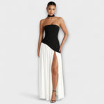 • Kontrastní design: Působivý černý top bez ramínek kombinovaný s volnou bílou sukní pro vzhled vysoké módy.