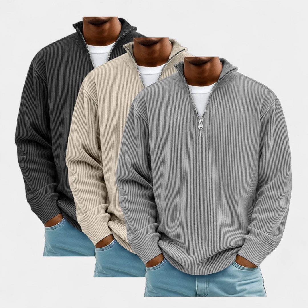 Tento výhodný balíček tří elegantních svetrů Martin přináší dokonalou kombinaci hřejivosti a ležérní elegance. Každý svetr má moderní střih s polo zipem, díky kterému snadno přizpůsobíte vzhled každé příležitosti. Tři neutrální barvy vám umožní jednoduše kombinovat outfity a vždy působit upraveně – ať už jdete do práce nebo na víkendový odpočinek.