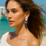 Objevte tyto výjimečné náušnice, které jsou ručně vyráběné a spojují dva třpytivé motýly. Každý detail je precizně navržen: horní část září bílými krystaly, zatímco dolní část je zdobena modrými a tmavými kameny. Tato kombinace vytváří soubor kontrastů a harmonií, který okouzluje.