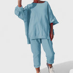 Souprava Andrea vznikla pro moderní ženy, které ocení jemný a uvolněný design při zachování stylu. Měkký top s lehce oversized střihem doplňují rovné, volné kalhoty s pružným pasem — ideální outfit pro práci z domova, relax nebo cestování.