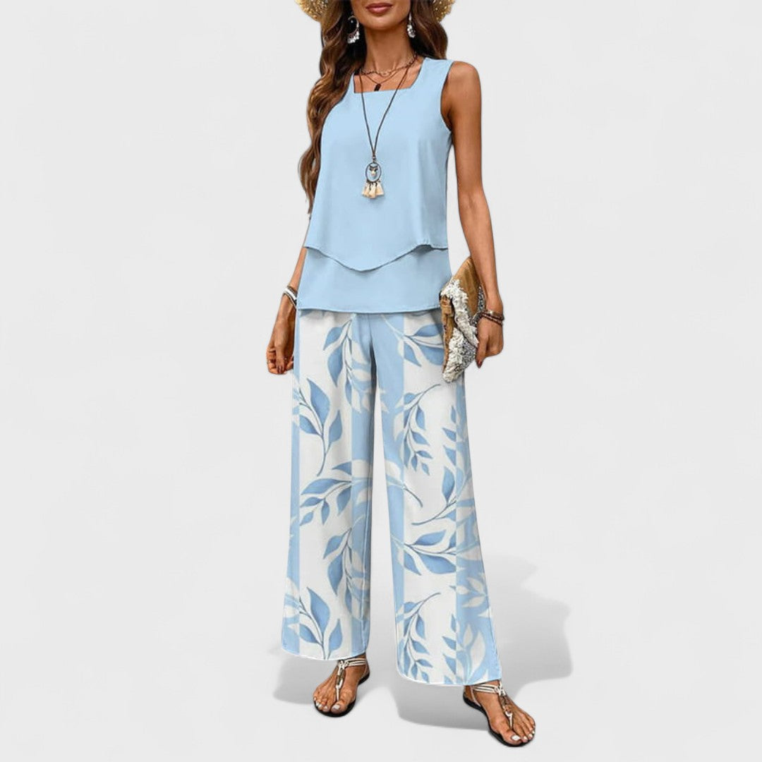 Set Katarína přináší luxus jednoduchosti a pohodlí ve stylové kombinaci. Horní část bez rukávů jemně obepíná postavu, zatímco lehké kalhoty s volným střihem dodávají pocit vzdušnosti a svobody. Vyrobený z kvalitního materiálu s jemným leskem, tento set je skvělou volbou pro pracovní dny, setkání s přáteli či letní večery plné elegance.