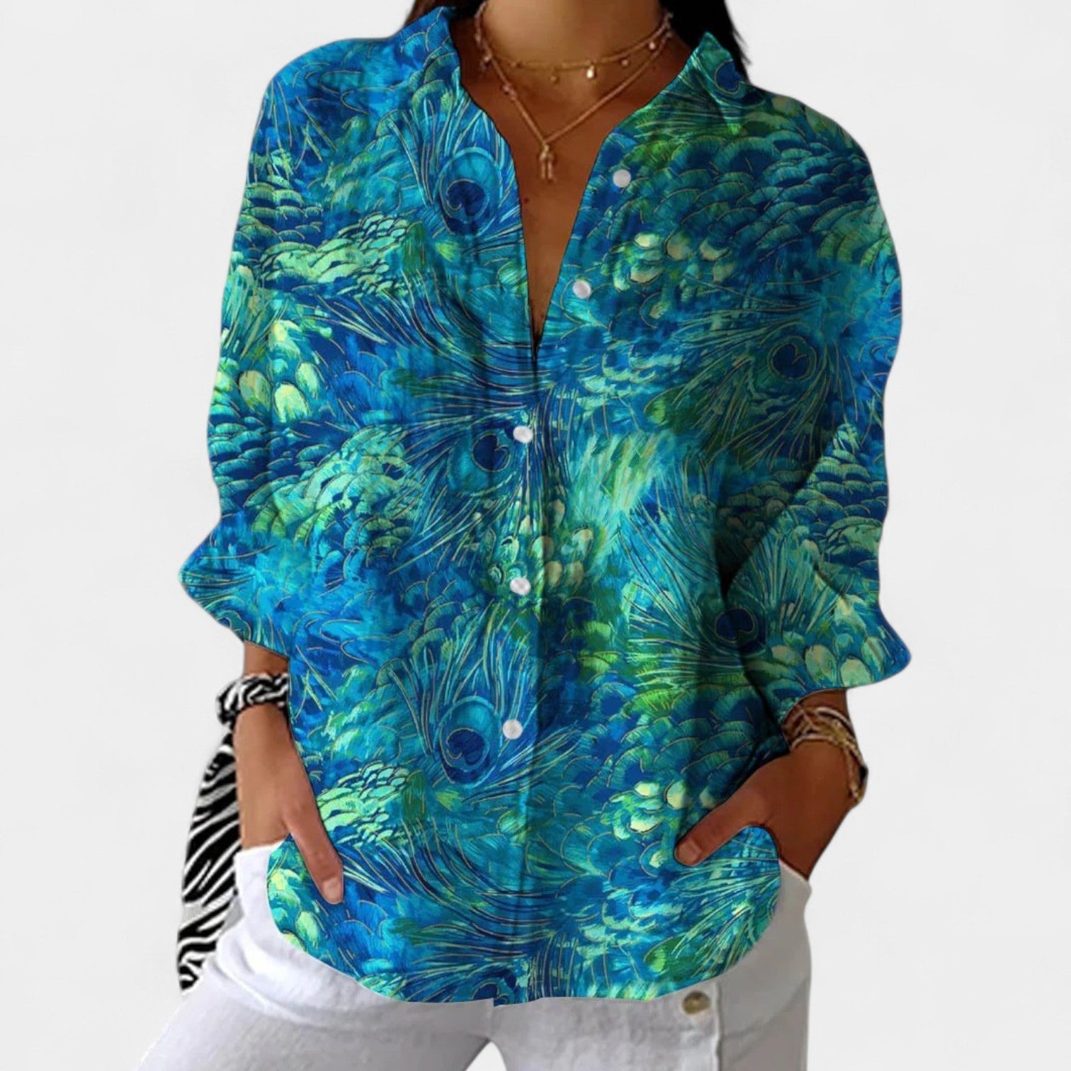 Halenka Kristýna je ideální volbou pro ty, kdo chtějí spojit komfort a styl v jednom. Její volný střih a vzdušný materiál zajišťují příjemné nošení i během nejteplejších dnů, zatímco barevný a hravý potisk dodává outfitu živost a originalitu. Perfektní k šortkám, džínům i sukni.